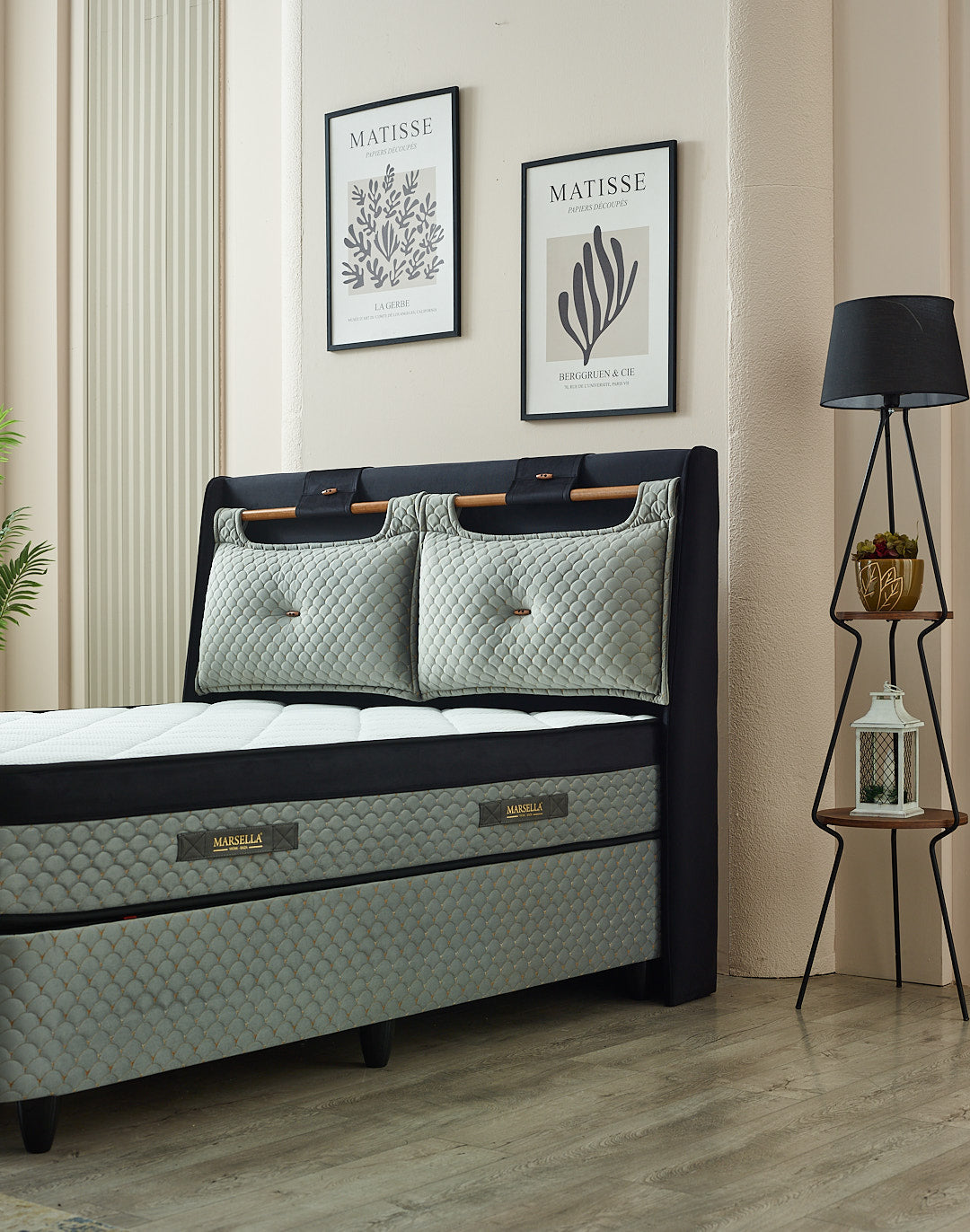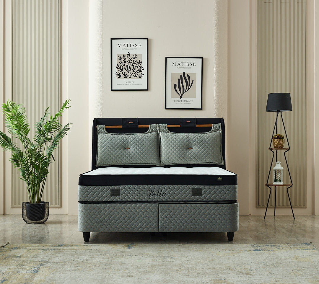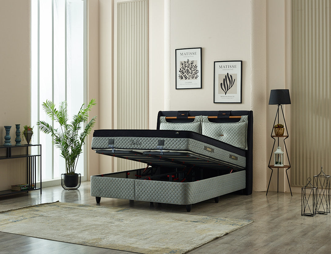 Het Bella model is uitgerust met twee royale opbergboxen, eenvoudig te openen vanaf het voeteinde. Onder het volledige matrasoppervlak bevindt zich veel opbergruimte, ideaal voor extra dekens, kussens of persoonlijke items. De boxen hebben een stevig metalen frame en zijn bekleed met dezelfde stof als de boxspring, wat zorgt voor een samenhangend en stijlvol geheel. Dankzij soepele gasveren is het openen en sluiten moeiteloos.